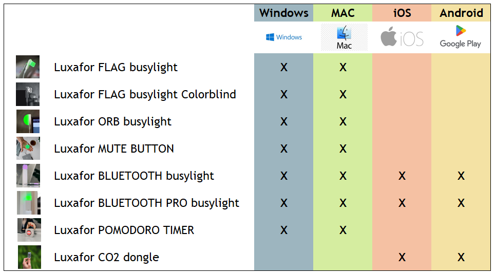 Luxafors programvarepakke er kompatibel med Windows, MAC, iOS og Android. Programmene kan brukes til å kontrollere et bredt spekter av Luxafor-produkter. Oversikten viser hvilke Luxafor-produkter som kan betjenes med Luxafor-programmer / APP-er.